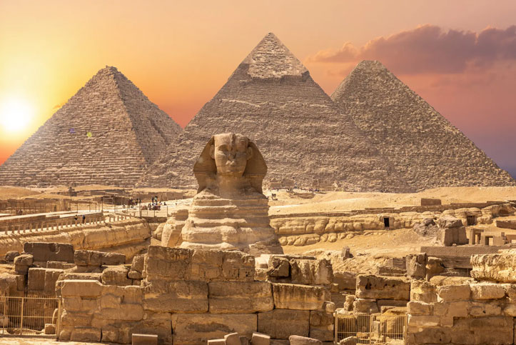 The mysterious Sphinx, with the face of Khafra and the body of a lion, stands nearby, guarding the land of the Pharaohs. The Sphinx and the three pyramids are considered one of the Seven Wonders of the Ancient World.